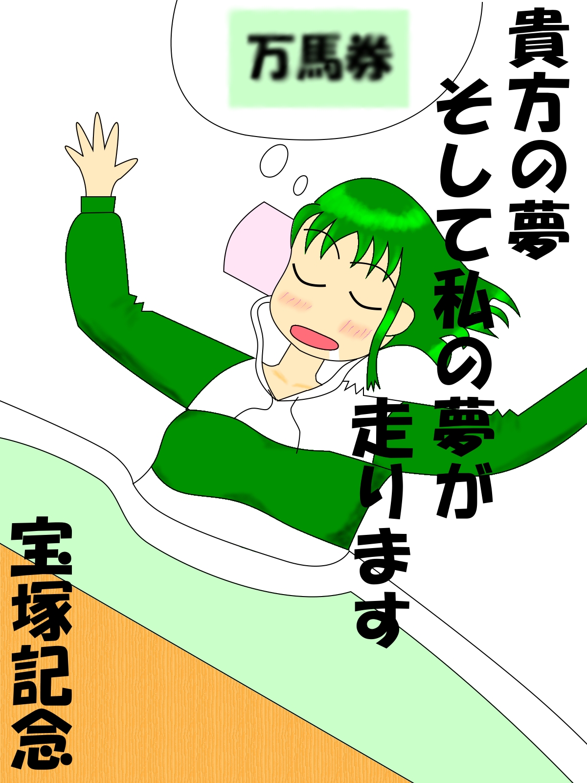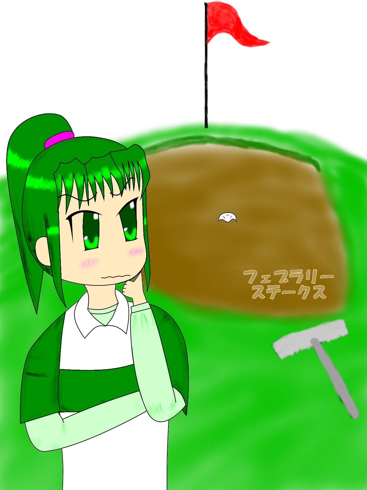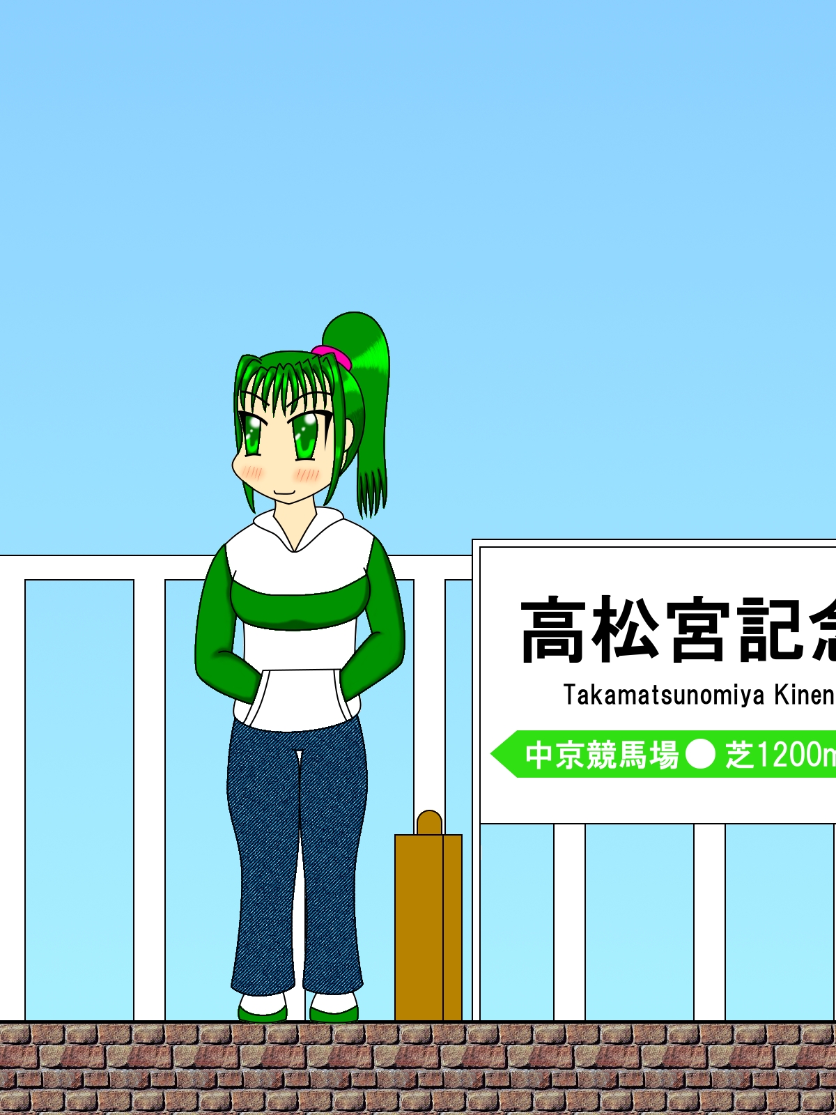 久し振りに・・・ | ■「悩める金曜日」 ■「中山大障害リベンジ」 悩める金曜日の方は大分前に描き終わっては居たんですけどねぇ。アップするのをすっかり・・・テヘッ まぁまぁまぁまぁまぁ自分では良く描けた方なんじゃない?とか自画自賛してますが、まだまだですな。 中山大障害の方は、今までとちょっと変えて、パースを意識してみましたよ。 難しすぎ。単なる四角い箱ならばともかく、台形の跳び箱は難しい。あぁでもないこうでも無いと・・・ 塗りの方も、レンガとかもう・・・目地を白くしましたが、レンガの目地って白?・・・難しいな・・・ 精進が足らんですな。 秋初戦のスプリンターズステークスは凄かったですなぁ。 カレンチャン!なんかもう展開を見てて腹も立たないくらいのレース。 それよりも、スパーン!とキレる脚を見せてくれたカレンチャンに感動した。 去年の日本勢の不甲斐なさを払拭する展開。日本馬もまだまだ捨てたもんじゃないですな。 9月13日 最後のセリフ口に出すまで困ってた貴方 |