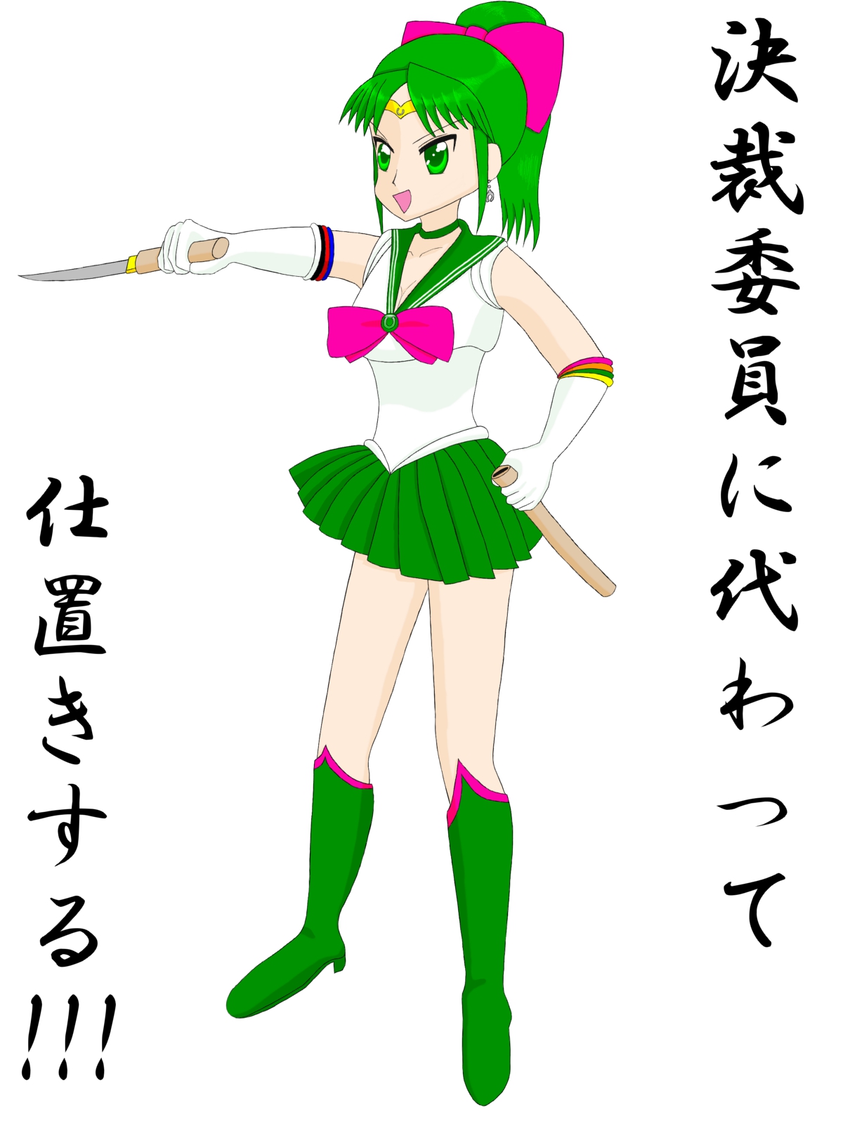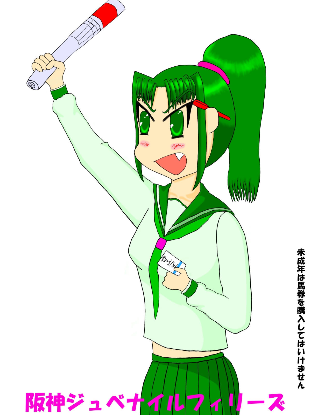 早速。 | ■「競馬戦士セーラーターフ」 キャプションは要らない。と言った舌の根も乾かぬうちに、堂々とテキストを放り込んだ絵を描いてみました。 その前に、カラーリングが、ジュピターとモロ被り。 描きながら、ぼんやりとカラーリングを思い浮かべていたのですが、塗る前に確認したらモロ被りしてた。 ポニテまで被ってやがる・・・ 一応、肘の所の蛇腹は、枠色になってますが、そんなのどうでもいいレベルで被ってるんだよなぁ。 しかも、腰のリボン忘れてるし。 ブーツは一応違うけど・・・ 武器の方はどうなんでしょ。魔法とか関係無さそうですなぁ。 すーっと背後から近寄って、ズブッと・・・ しかも、決裁委員に代わってって・・・審議になったくらいで消されちゃたまらん。 しっかし、ポージングが残念ですなぁ。 キメポーズっぽくしたかったんですけどねぇ。何分、魔法少女モノのアニメって見ないもので・・・ 参考になる様なキメポーズなんて一つも思い浮かばなかった。 想像力が足りませんなぁ。まぁ、戦争映画だのヤクザ映画だの時代劇だのが大好きなもんで。 中々、魔法とか魔術とかが苦手なんですよねぇ。嫌いじゃないんだけど、空を飛ぶくらいしか思いつかない。 キメポーズとってる暇があったら、背後に回ればいいのに。とか身も蓋も無い事を考えちゃう。 背後から刺すのなら、そもそも変身なんかいらないだろうって話になっちゃう。 ただ、嫌いじゃ無い。あまり得意じゃ無いってだけで。 嫌いだったら描くワケが無いし、萌えるんだけど、魔法で戦うってのがどうも。 まぁ、暴れん坊将軍もそうですけどね。「峰打ちします」って宣言したら誰も倒れんだろう。とか。 でも、大好き。う〜ん・・・ムチャクチャだ。 10月7日 どうしたもんかと嫌な空気 |