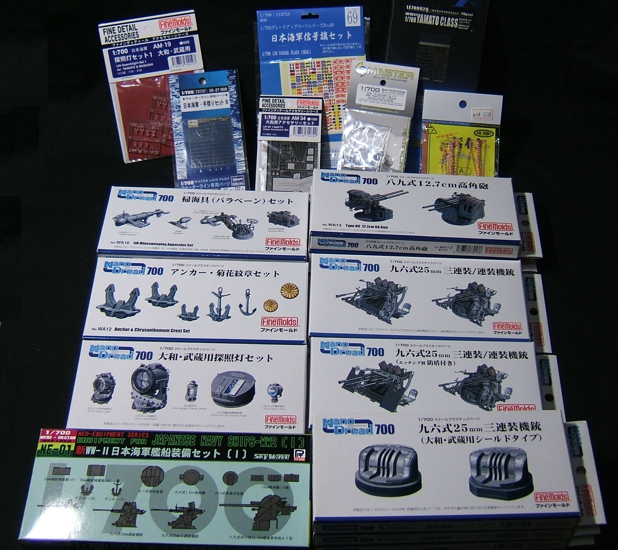 では、宣言通り製作記を書こうかなと思います。 | 製作するのは、1/700戦艦大和です。 コチラのキット ![]() 終焉時・フルハル・エッチング付。と言うキットです。 \3885也。まぁ安いんでしょうかね。タミヤのは確か\2600前後だったはず。そちらはWLですし。エッチングも付いて、フルハルですから。 まぁ妥当か、少し安いとは思いますよ。問題が無いワケじゃないってのはしょうがないとは思いますけど。まぁ、詳しくはそのうち。 で、素組するのを淡々と書いても仕方ないし、それなら取説嫁って話ですから、今回は改造をします。 とは言っても、ポン付け出来るレベルだけの改造であって、そこまでスンゲー事をするワケじゃないです。 そもそも、艦船模型なんて、素組以外した事無いんですから、正直言って、初挑戦って言っても過言じゃ無いです。 なので、そんな難しい事が出来ようはずも無いです。それに、ちょっとした寸法ミスでも700倍したらとんでもない事になりますから、大掛かりな事なんてとてもとても。 で、買ったモノの一覧。 ![]() ![]() 書き出すのも面倒臭いレベルで買い漁ってしまいました。バカだなぁ。自分がイヤになる。 (以下:FM=ファインモールド:PR=ピットロード) FM:パラベーンセット*1@¥1260 FM:アンカー・菊花紋章セット*1@¥1260 FM:大和・武蔵用探照灯セット*1@¥1260 FM:八九式12.7cm高角砲*2@¥1260 FM:九六式25mm三連装・連装機銃*1@¥1260 FM:九六式25mm三連装・連装機銃盾*1@¥1575 FM:九六式25mm三連装機銃シールド*2@¥1575 PR:日本海軍艦船装備セットI*1@¥1890 ここまでの合計は、¥14,175也。あ〜あ。予算1万円だったのに、既に4000円もオーバーしとるよ。 溜息しか出てこない。完成しなかった日にゃ、どうすりゃいいんだ。 続いて。 MASTER:15.5cm副砲セット@¥630 ライオンロア:46cm主砲セット@¥1701 ハセガワ:手摺セットB@¥945 FM:大和用アクセサリセット@¥1365 FM:手摺セット1@¥1365 FM:探照灯セット1@630(実は不要だった罠) プロホビー:ホビーチェーン中大@¥420 フジミ:日本海軍信号旗セット@¥840 ここまでの小計¥7896也。 総計¥22,071也。 もうバカでしょ。予算を1万円もオーバーしたよ。 これにキットの代金が載ると思うと恐ろしい。 ちょっと改造のつもりが、2万円かよ…1/350買った方が早かったんじゃないだろうか その上、不要なモノまで買ってるし。本当は、シールドタイプの機銃は3つ必要なんですけど、もう勘弁して下さい。 キット標準ので勘弁して下さい。これ以上掛けたらバカの極みになってしまいます。 金の勘定の話をしてると鬱になってくるので、次。 ネットで検索してると、中々出てこない情報を載せます。 ![]() このエッチングが肝。「どんなのが付いてくるんだろ」と探しても探しても出てこない! それが分からなきゃ、どこまで買っていいものか分からないので、困ってしまいました。 なので、紹介します。参考にして下さい。 外舷の手摺1周分・ジブクレーンとアンテナ支柱・無線電話・一号三型電探・カタパルト・副砲アンテナ支柱・艦橋最上部アンテナ・方位探針儀等々 です。つまり、手摺は、オイラの様に別売の小さいのだけ買えば良いって事です。 ふぅ疲れた。主に金の勘定で疲れた。 ちなみに、全部定価で計算しての金額ですので、悪しからず。実際には某密林で買っておりますので、もうちょっと安いです。 そうは言っても、半額とかでは無いので、大差は無いのでしょうけどね。 それと、オイラは別に戦艦マニアじゃありません。昔から好きではありましたけどね。 文に起こすと難しいのですが「艦隊」としての「運用」とか「システム」みたいな大きな括りで好きだったので、個々の戦艦自体に詳しいワケじゃありません。 なので、知識も無ければ専門用語も分かりません。なので、時代考証なんかも滅茶苦茶かも知れません。が、お許し下さい。 何せ最近まで「最終時の大和は舷窓が塞いであった」って事すら知らなかったんですから。 流石に、イスカンダルまでは行ってない。と言う事は知ってたのですけどね。 兎にも角にも、金をかけてしまった以上、後には引けないので、一応は作ります。 で、元を取るために製作記も続けようとは思います。あんまり頻繁では無いかも知れませんけど。 出来れば大和を造る際の参考になれば・・・ 6月16日 今夜世界は二人のものさ |